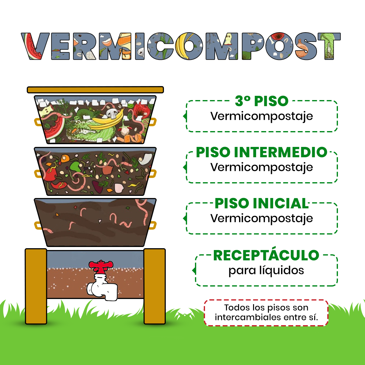 El proceso comienza en PISO INICIAL. Una vez que esta se llena y las lombrices han avanzado en la descomposición del material, se comienza a agregar alimento en la bandeja intermedia.
